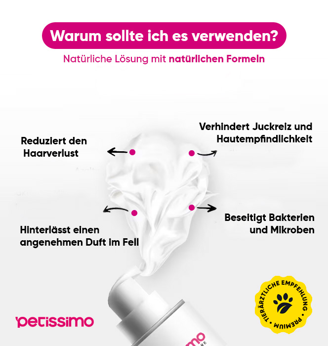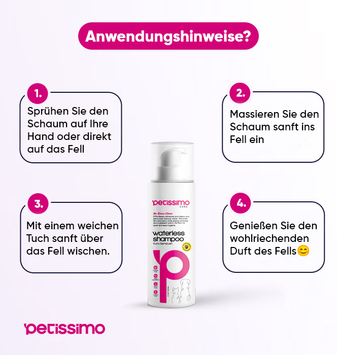 Das Petissimo Trockenshampoo nährt das Fell mit seiner hochwertigen und organischen Formel, macht es dichter und reduziert den Haarausfall erheblich. Für Haustiere, die Wasser nicht mögen, entwickelt, kann dieses Shampoo ihr neues Lieblingspflegeprodukt werden.